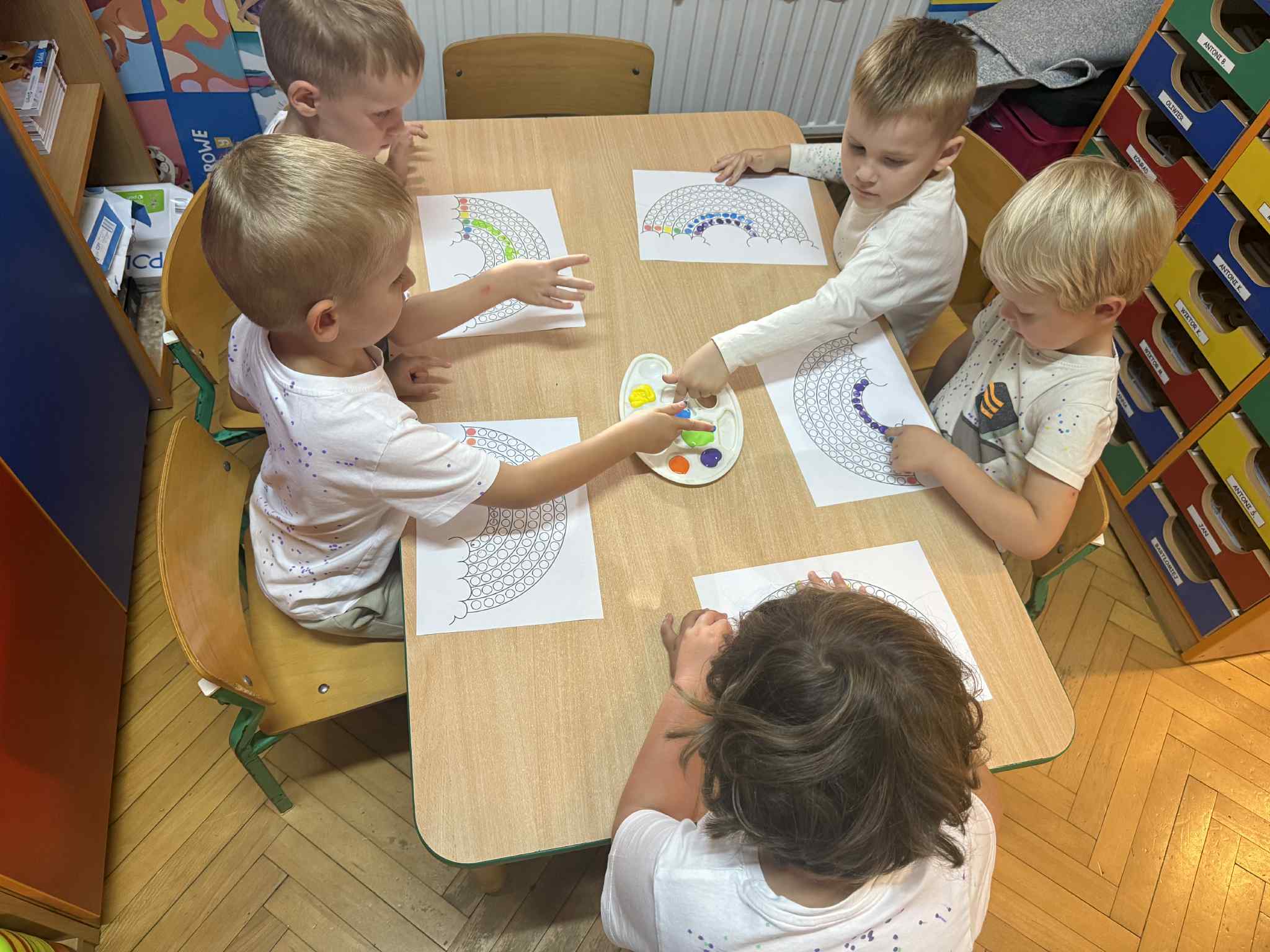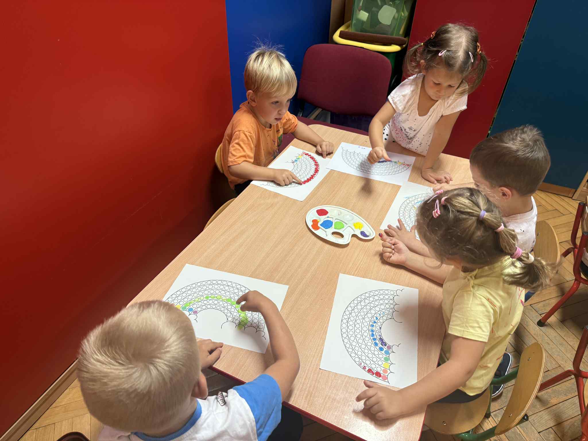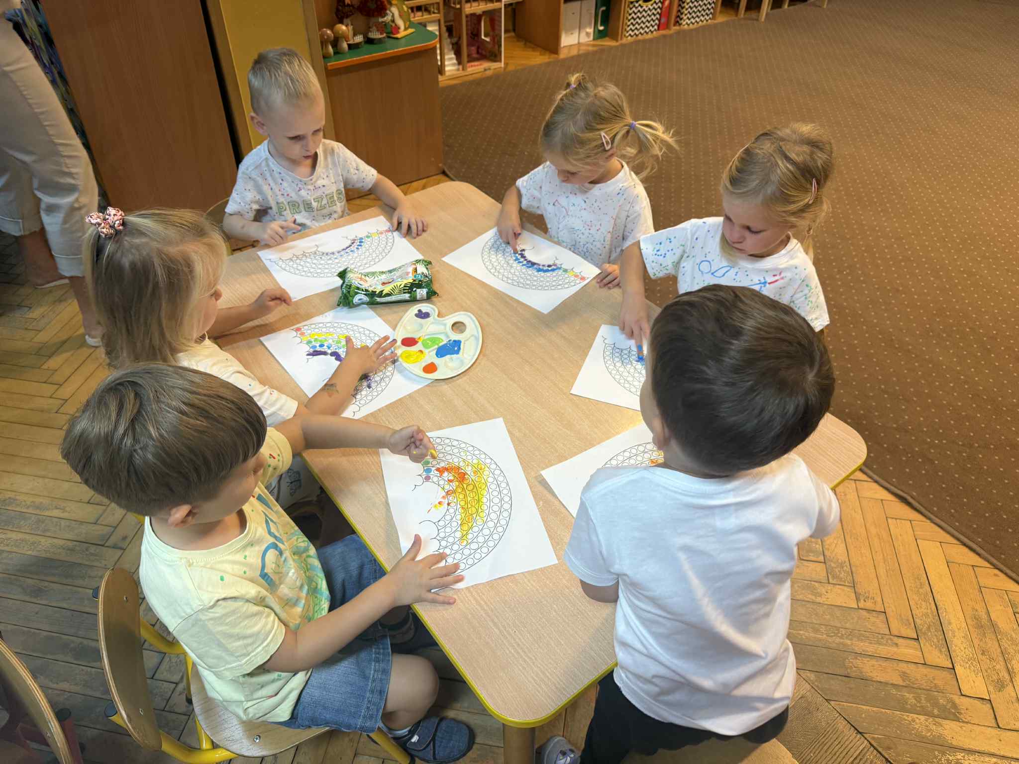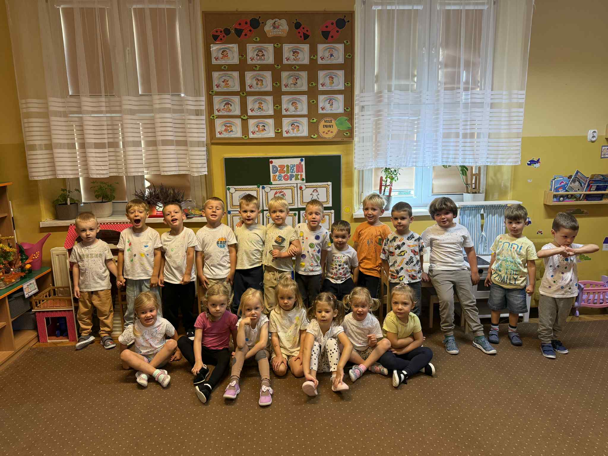 Nasze maluchy 15.09 obchodziły Międzynarodowy Dzień Kropki pełen twórczej zabawy i radości! Dzieci wysłuchały opowiadania o Vashti, tworzyły własne, kolorowe podkoszulki w kropki, ćwiczyły przy „kropkowej gimnastyce”, układały gąsienice według wzoru i szukały kropek w ogrodzie. Na zakończenie malowały tęczę palcami, odkrywając, że każdy ma w sobie moc tworzenia i wyobraźni.