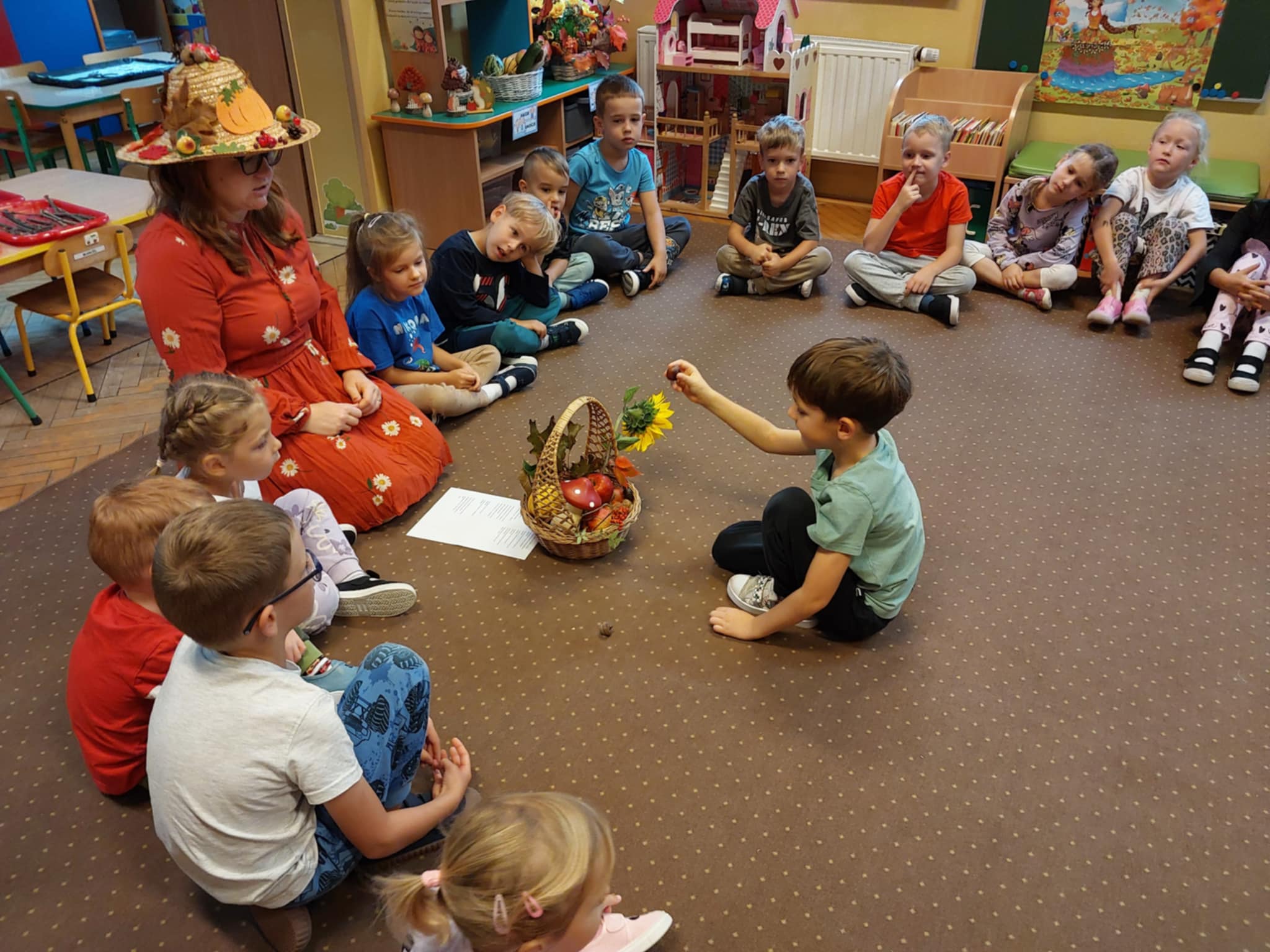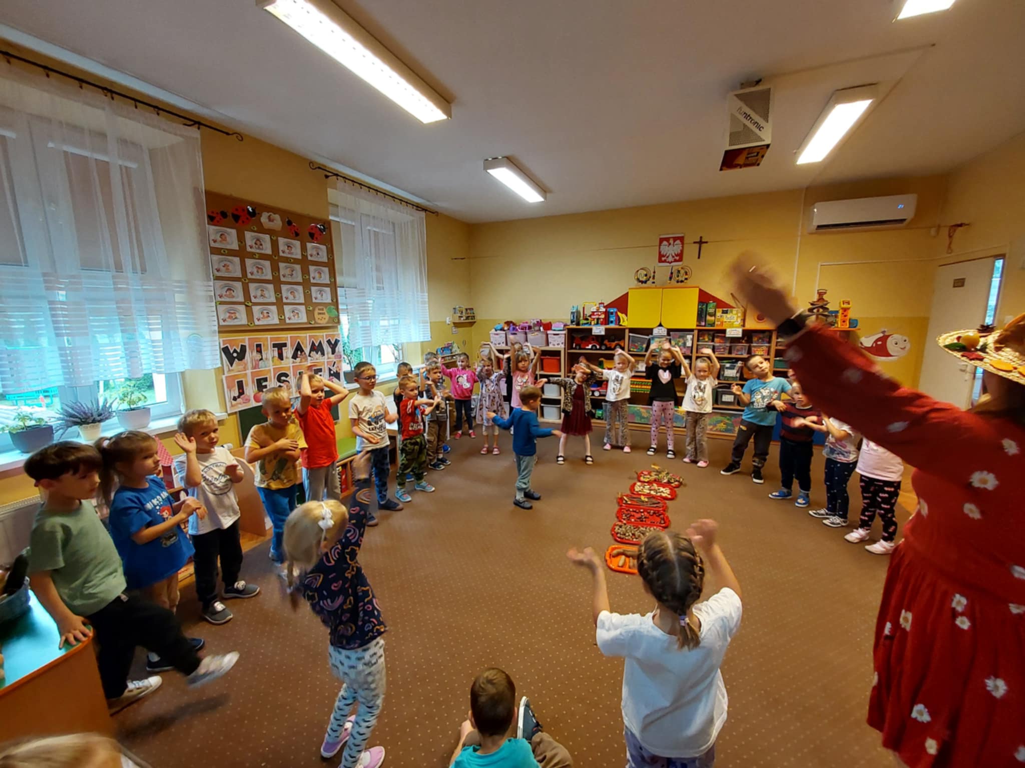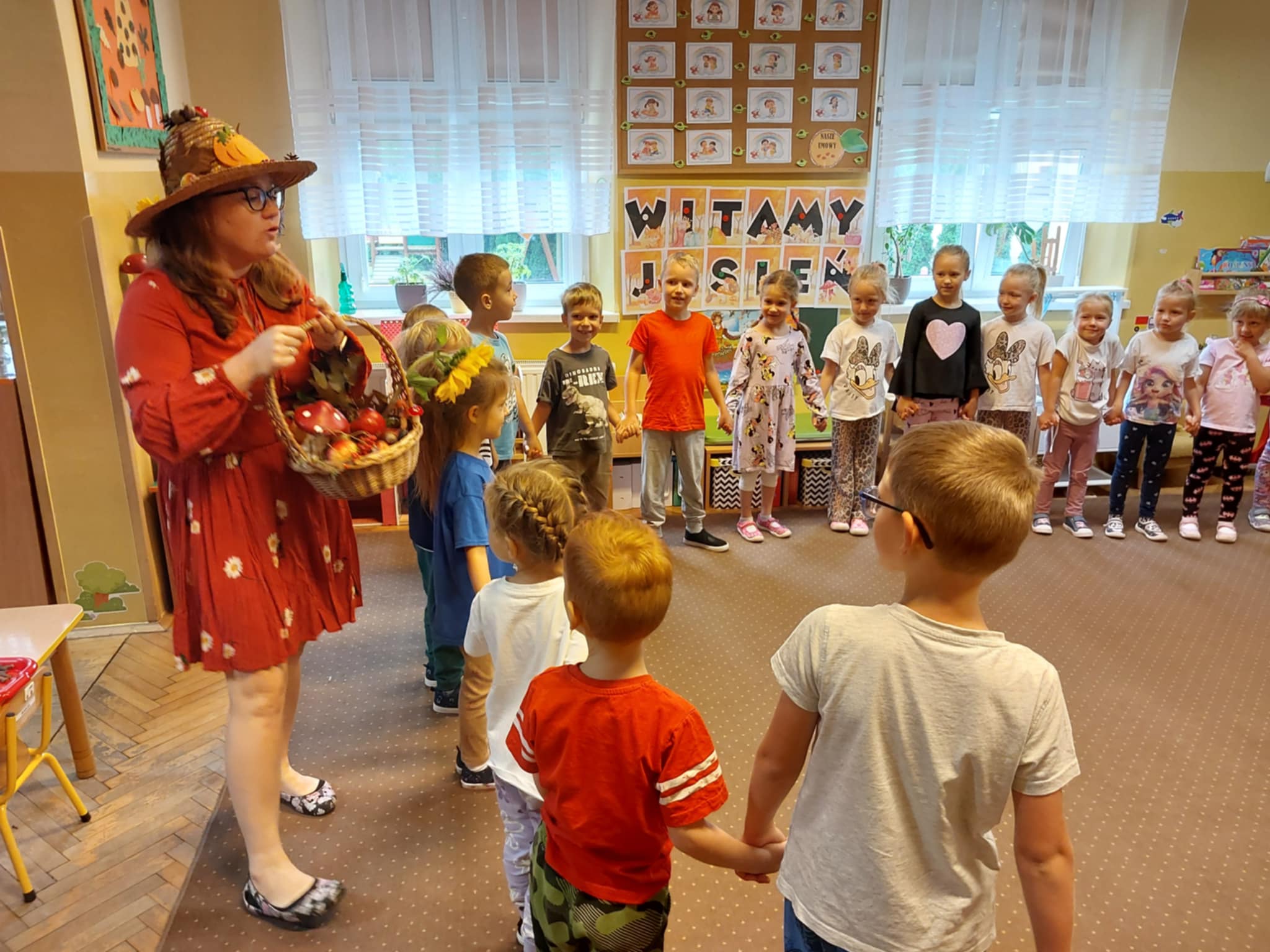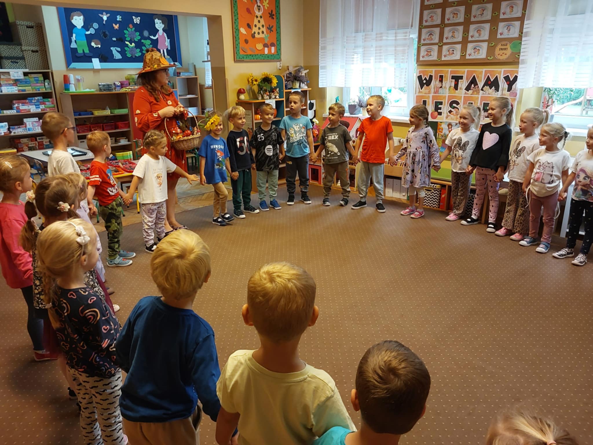 23.09 do naszego przedszkola zawitała Pani Jesień, niosąc ze sobą kosz pełen darów lasu i ogrodu. Dzieci rozwiązywały jesienne zagadki słowne, brały udział w radosnych zabawach muzycznych i przemierzały sensoryczną ścieżkę złożoną z darów natury. Wspólnie przeprowadziły eksperyment „Jesienne drzewo”, który wzbudził wiele emocji i ciekawości. Nie zabrakło też słodkiego, dyniowego poczęstunku – za który serdecznie dziękujemy mamie Szymonka. Na zakończenie każdy Maluszek stworzyło własny, kolorowy jesienny wianuszek z zebranych dzień wcześniej liści, który będzie piękną pamiątką tego wyjątkowego dnia. Było radośnie, twórczo i bardzo jesiennie!