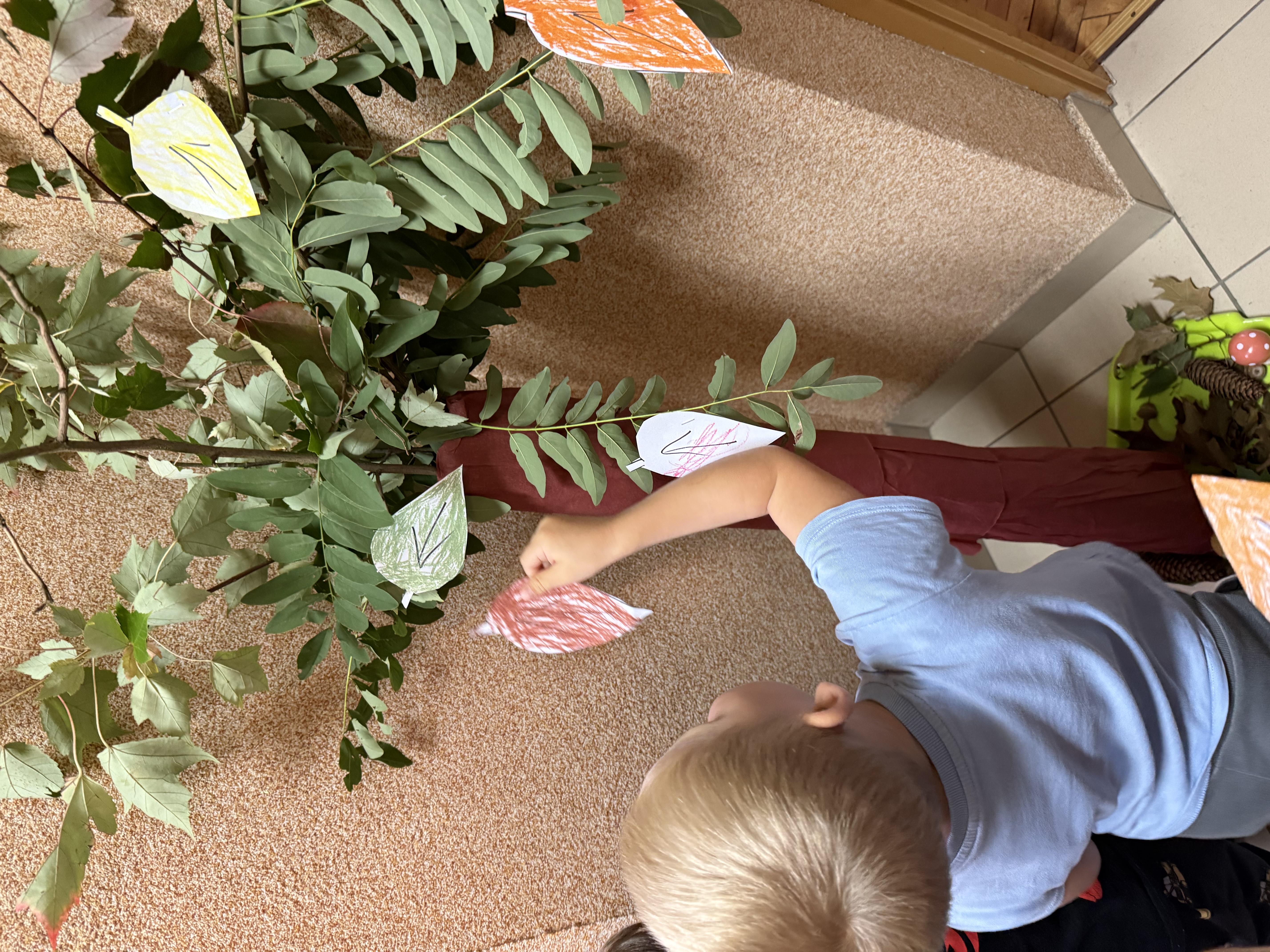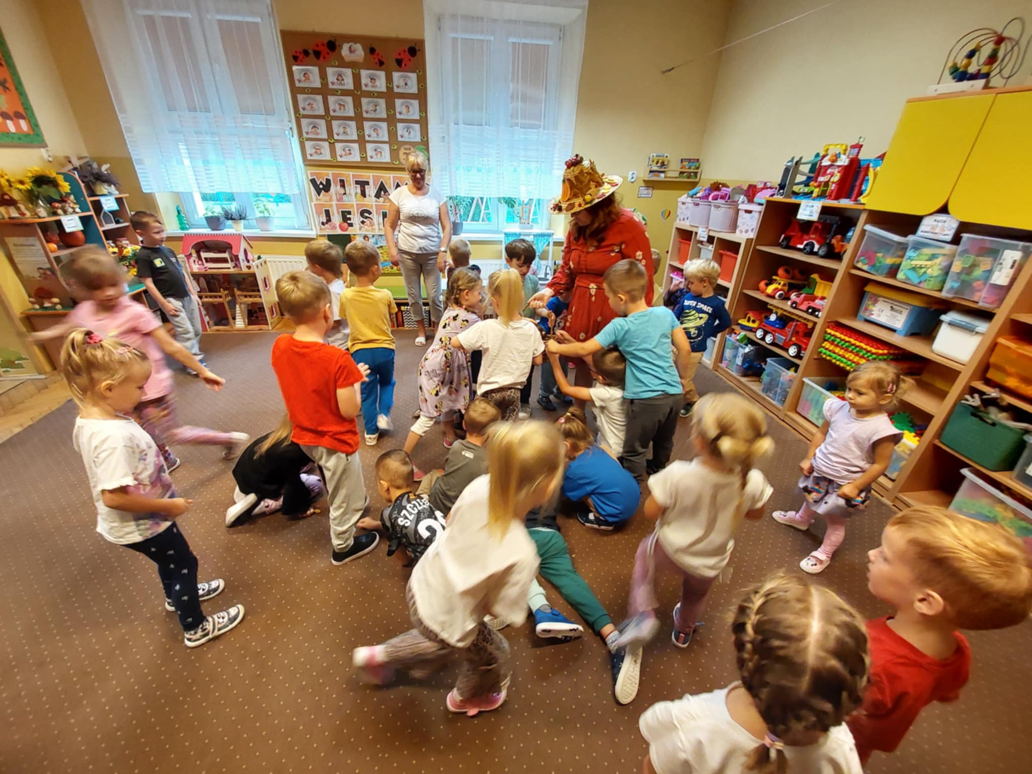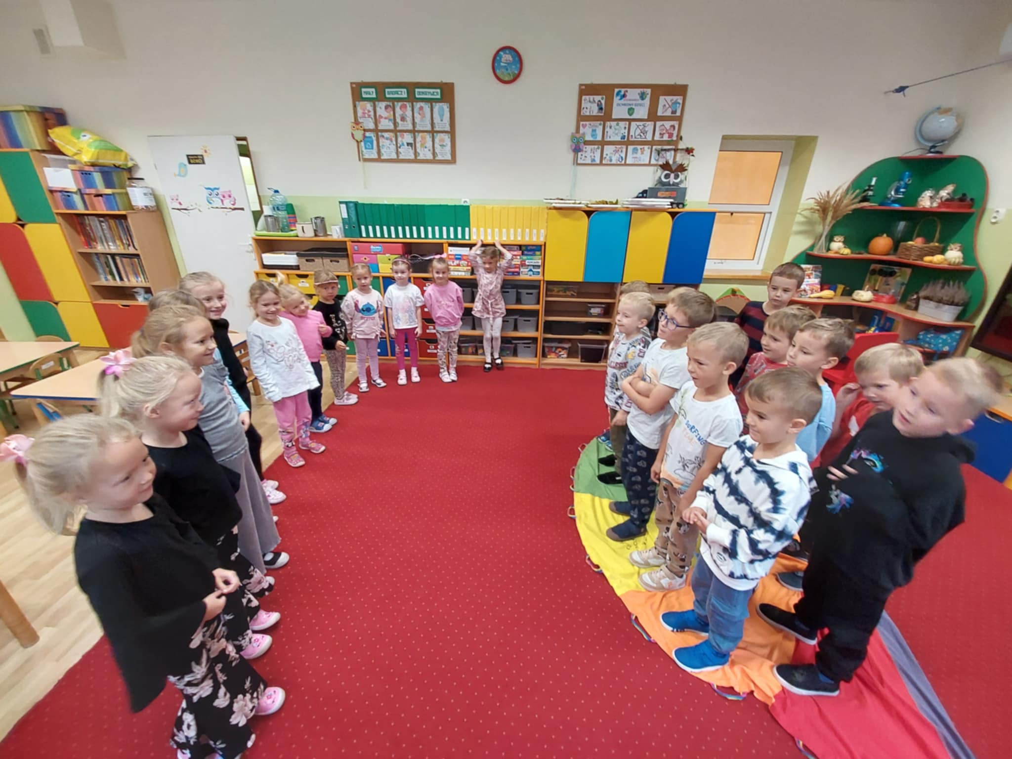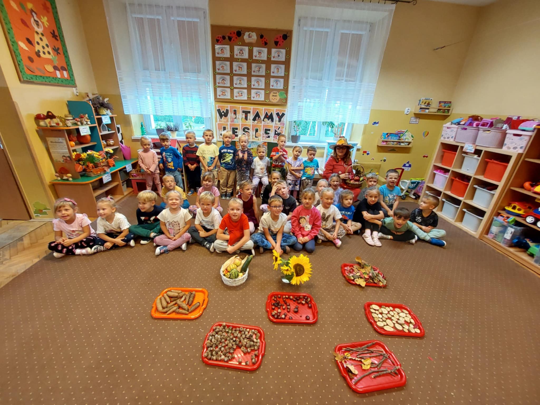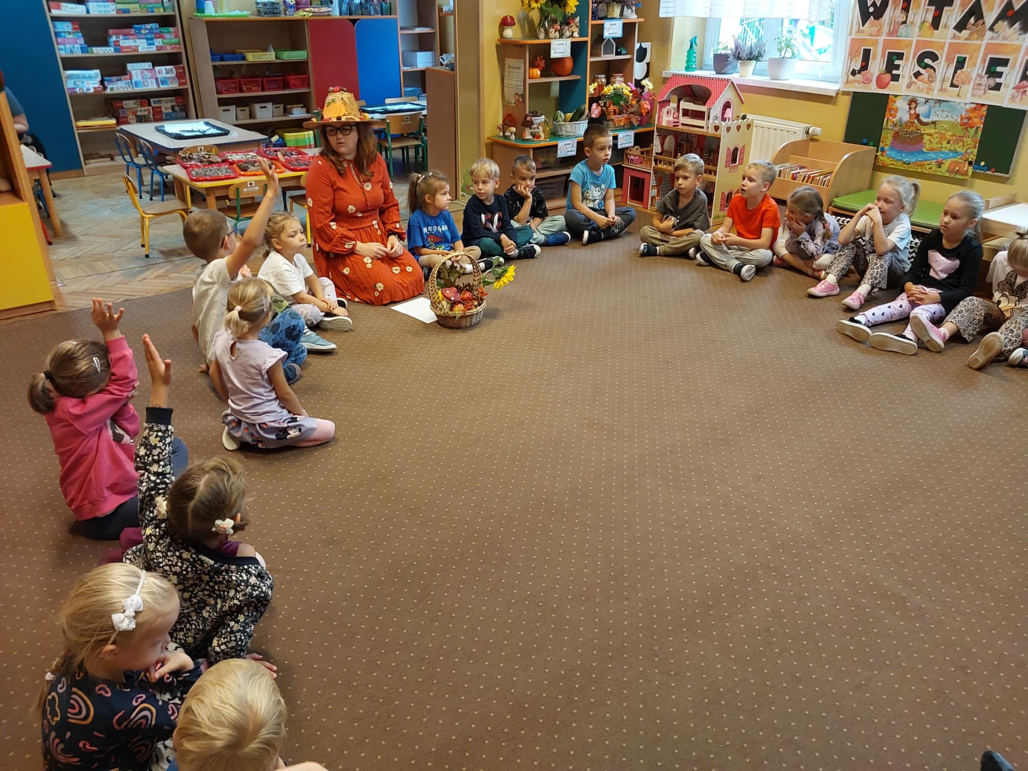 23.09 do naszego przedszkola zawitała Pani Jesień, niosąc ze sobą kosz pełen darów lasu i ogrodu. Dzieci rozwiązywały jesienne zagadki słowne, brały udział w radosnych zabawach muzycznych i przemierzały sensoryczną ścieżkę złożoną z darów natury. Wspólnie przeprowadziły eksperyment „Jesienne drzewo”, który wzbudził wiele emocji i ciekawości. Nie zabrakło też słodkiego, dyniowego poczęstunku – za który serdecznie dziękujemy mamie Szymonka. Na zakończenie każdy Maluszek stworzyło własny, kolorowy jesienny wianuszek z zebranych dzień wcześniej liści, który będzie piękną pamiątką tego wyjątkowego dnia. Było radośnie, twórczo i bardzo jesiennie!