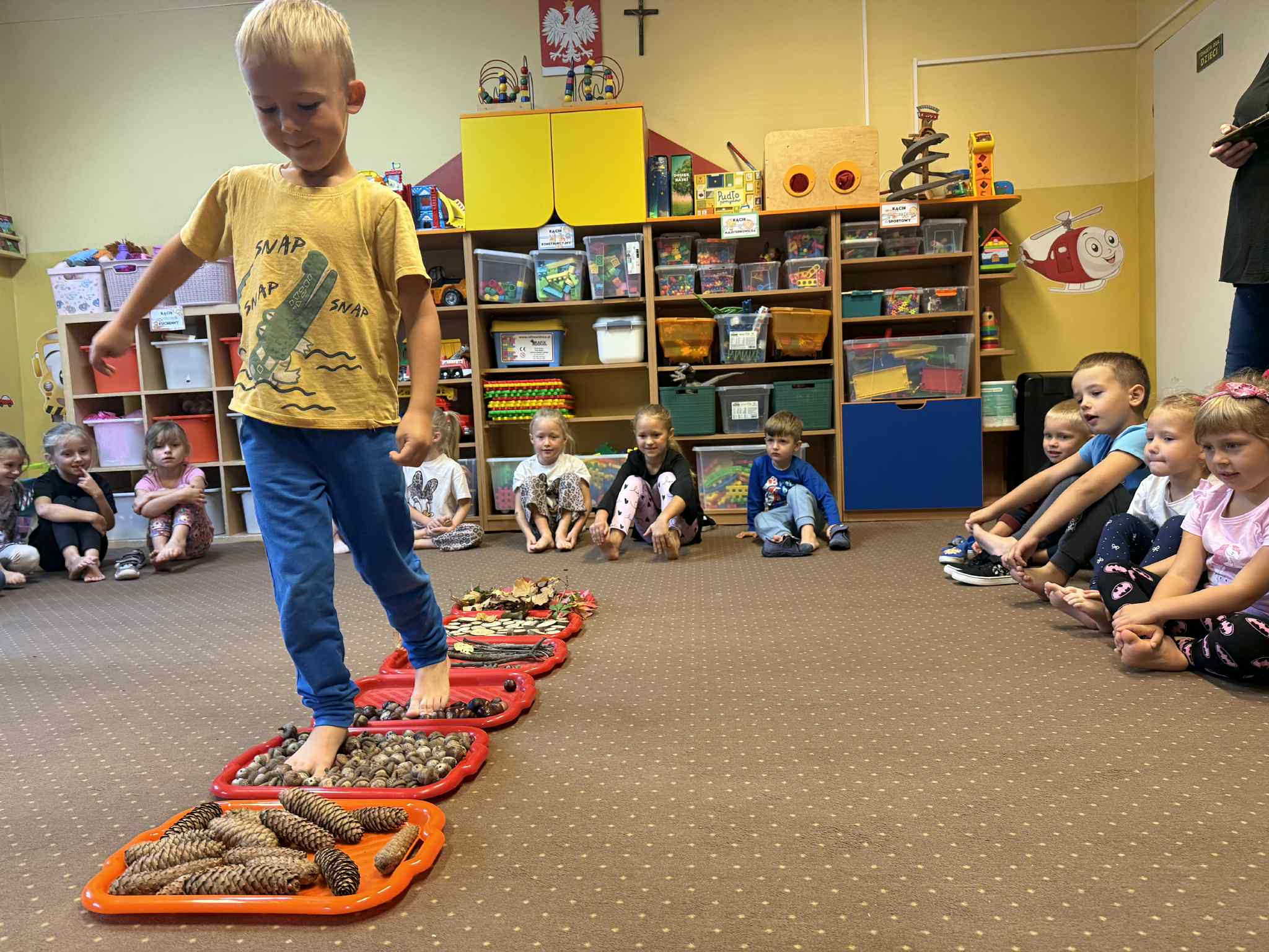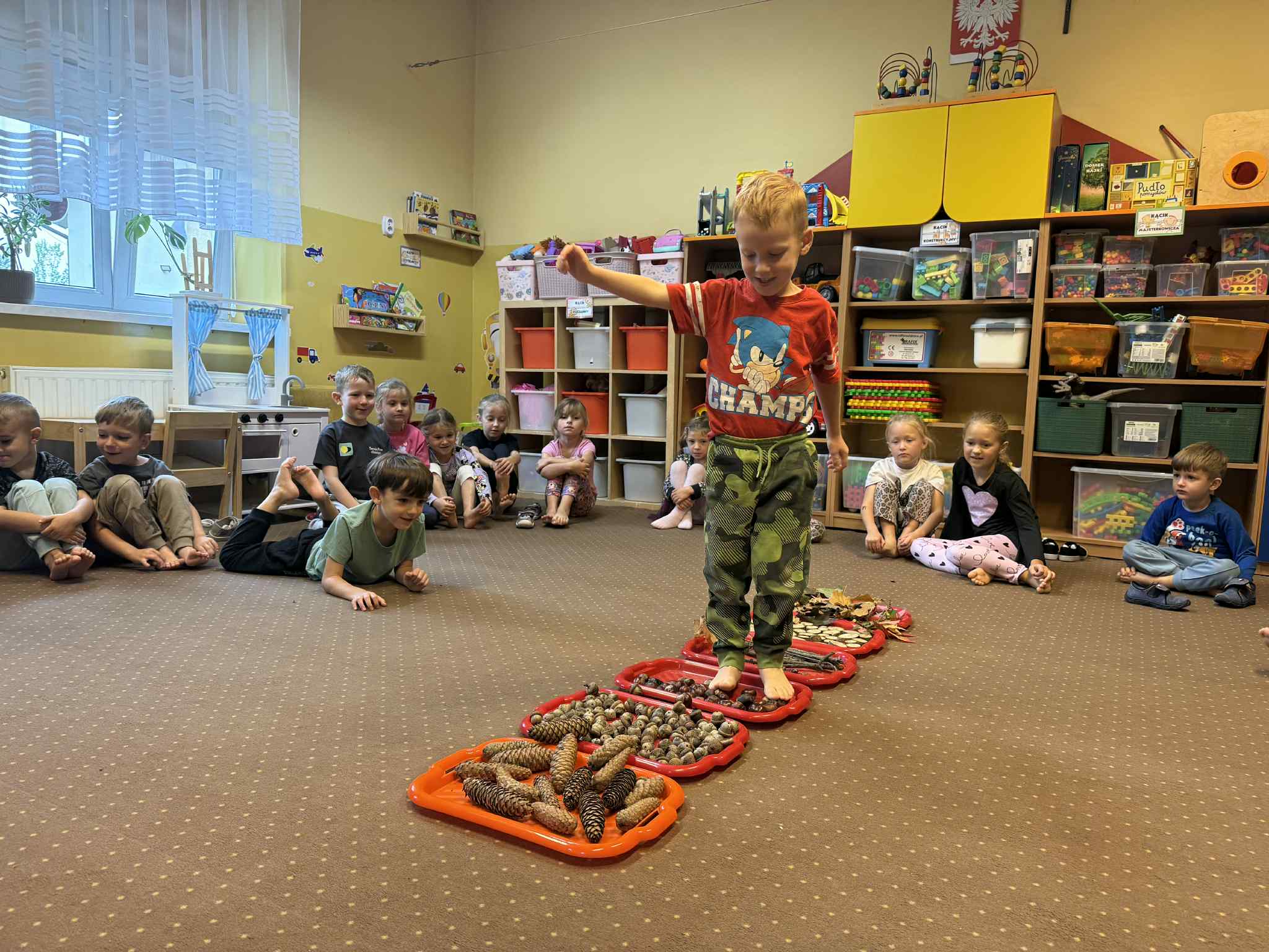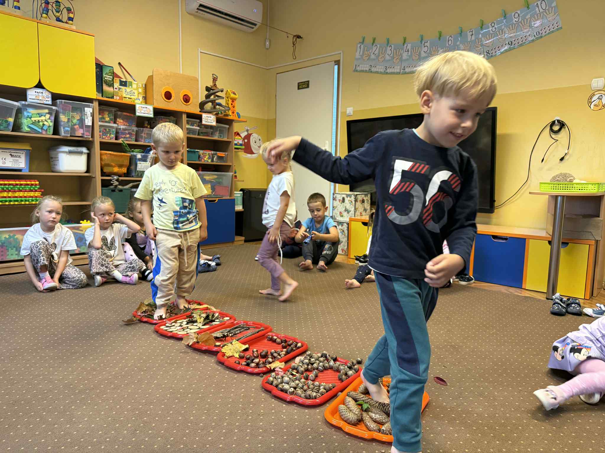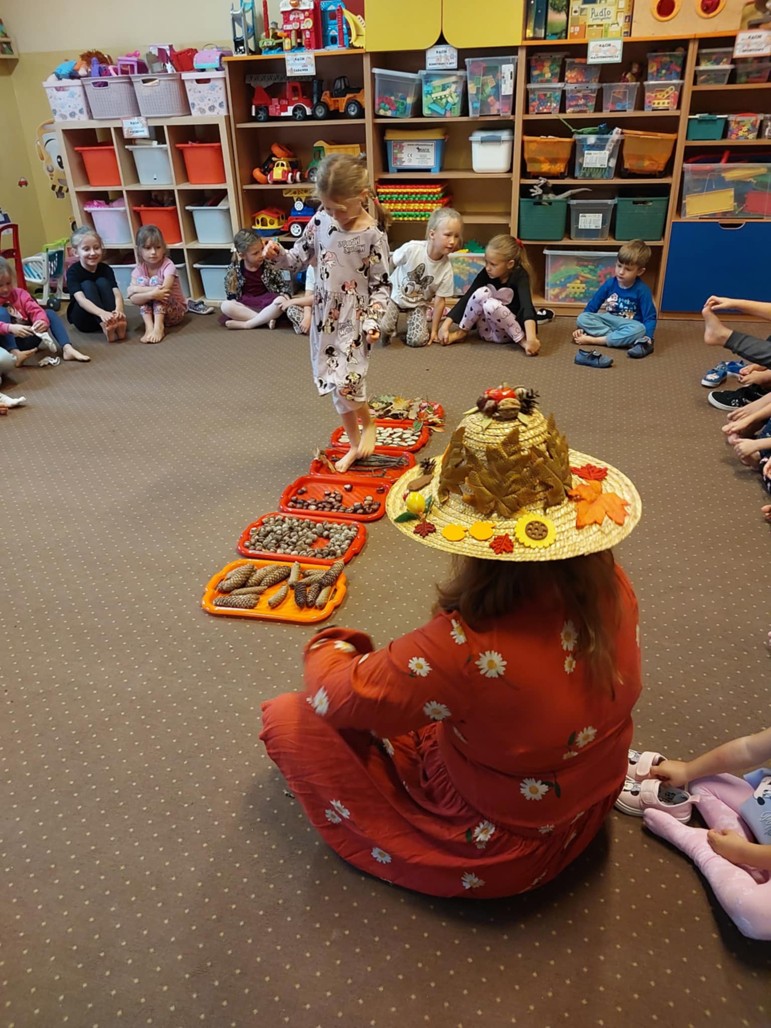 23.09 do naszego przedszkola zawitała Pani Jesień, niosąc ze sobą kosz pełen darów lasu i ogrodu. Dzieci rozwiązywały jesienne zagadki słowne, brały udział w radosnych zabawach muzycznych i przemierzały sensoryczną ścieżkę złożoną z darów natury. Wspólnie przeprowadziły eksperyment „Jesienne drzewo”, który wzbudził wiele emocji i ciekawości. Nie zabrakło też słodkiego, dyniowego poczęstunku – za który serdecznie dziękujemy mamie Szymonka. Na zakończenie każdy Maluszek stworzyło własny, kolorowy jesienny wianuszek z zebranych dzień wcześniej liści, który będzie piękną pamiątką tego wyjątkowego dnia. Było radośnie, twórczo i bardzo jesiennie!