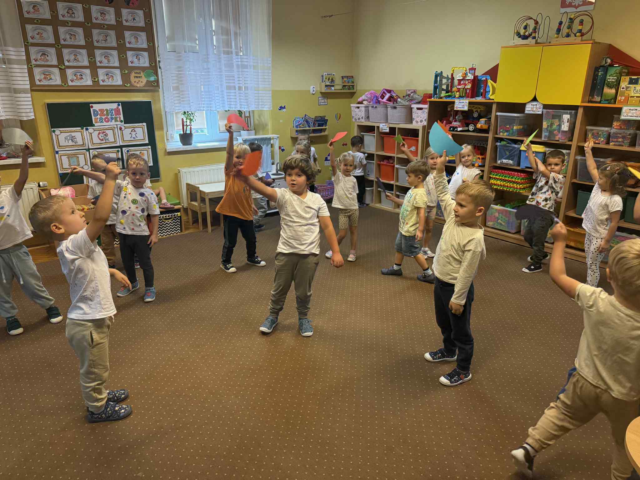 31 października Kropelki korzystając z pięknej jesiennej pogody wzięły udział w grze terenowej „Śladami Niepodległej”. Dzieci podzielone na 2 grupy: białą i czerwoną rozwiązywały zagadki i zadania pozostawione przez Misia Patriotę. Pierwsza część zmagań przedszkolaków miała miejsce na placu zabaw, gdzie Polska zostawiła dla nich pierwsze wskazówki i wyzwania, następnie ślady prowadziły do pobliskiego parku. W Parku ku zdziwieniu dzieci pośród liści i drzew czekały na nich flagi białoczerwone, każda drużyn miała zebrać ich jak najwięcej. Nie było to takie łatwe. Aby zdobyć flagę, dzieci współpracując w grupie musiały wykonać pewne zadania, m.in. przyporządkować herby do miast, ułożyć puzzle z symbolami narodowymi, zmierzyć odległość, zaśpiewać piosenkę o Polsce, wykonać kilka ćwiczeń gimnastycznych. To była świetna zabawa, która przypomniała dzieciom wartości patriotyczne.