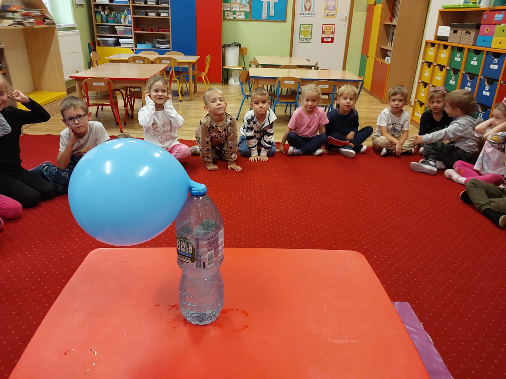 Maluszki w ostatnich dniach października zamieniły się w małych chemików i eksperymentowały. Poznając bliżej właściwości wody i powietrza Żabki przeprowadziły doświadczenia pt.: "Mieszanie się wody", "Czy balonik można inaczej nadmuchać?", "Wędrująca woda", "Tęcza". Przedszkolaki stworzyły także swoją "puchnącą farbę" z mąki, soli, wody i barwnika, którą wypełniły kontury jesiennej dyni.