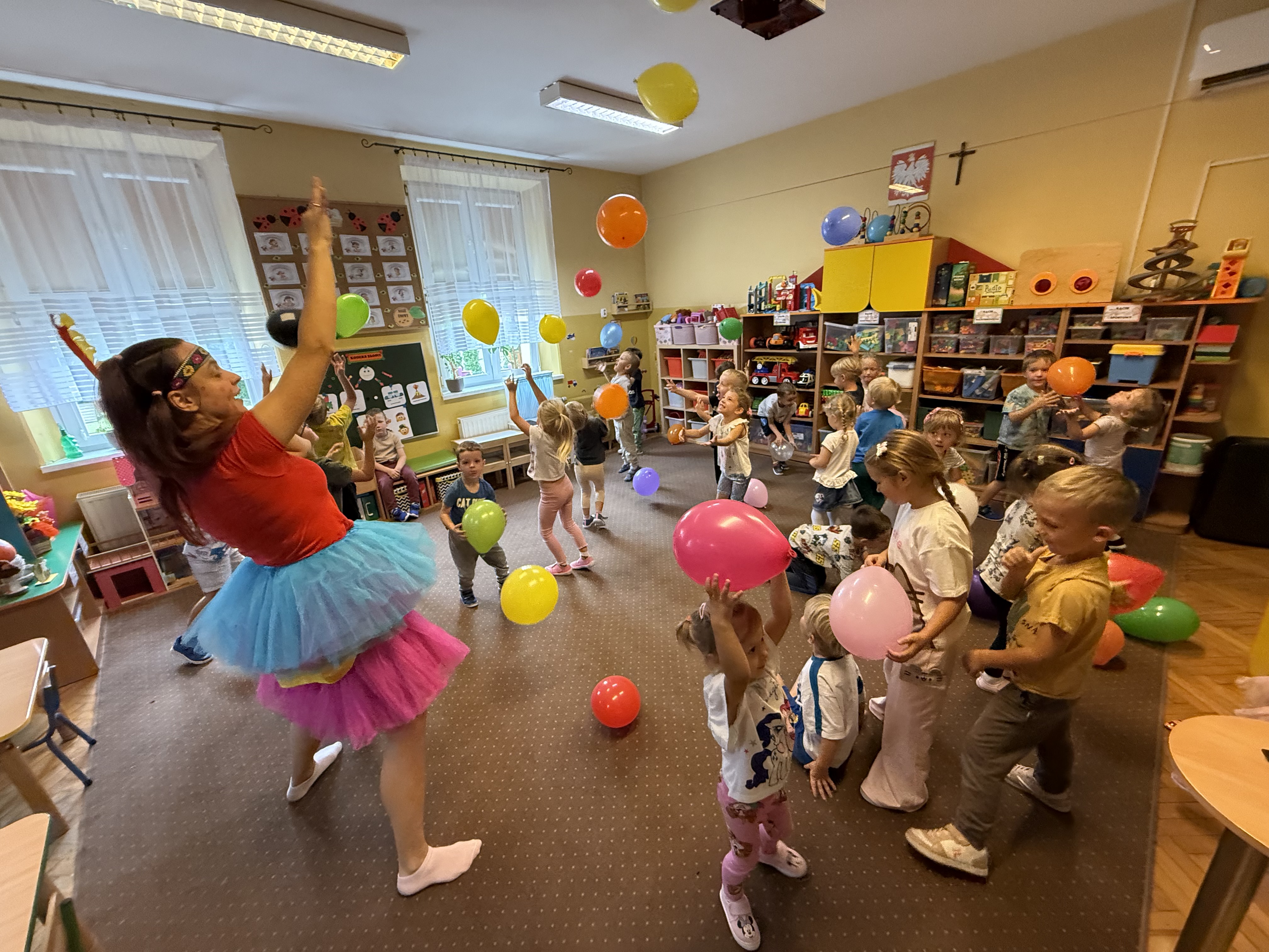 Uroczystość rozpoczęła się od montażu słowno-muzycznego w wykonaniu naszych przedszkolaków. Dzieci z ogromnym zaangażowaniem zaprezentowały inscenizację wiersza „Na straganie”, a także występy poświęcone emocjom. Nie zabrakło tańców i wierszy dedykowanych mamom i tatom, a także wyjątkowego tańca APT, który zachwycił wszystkich obecnych.