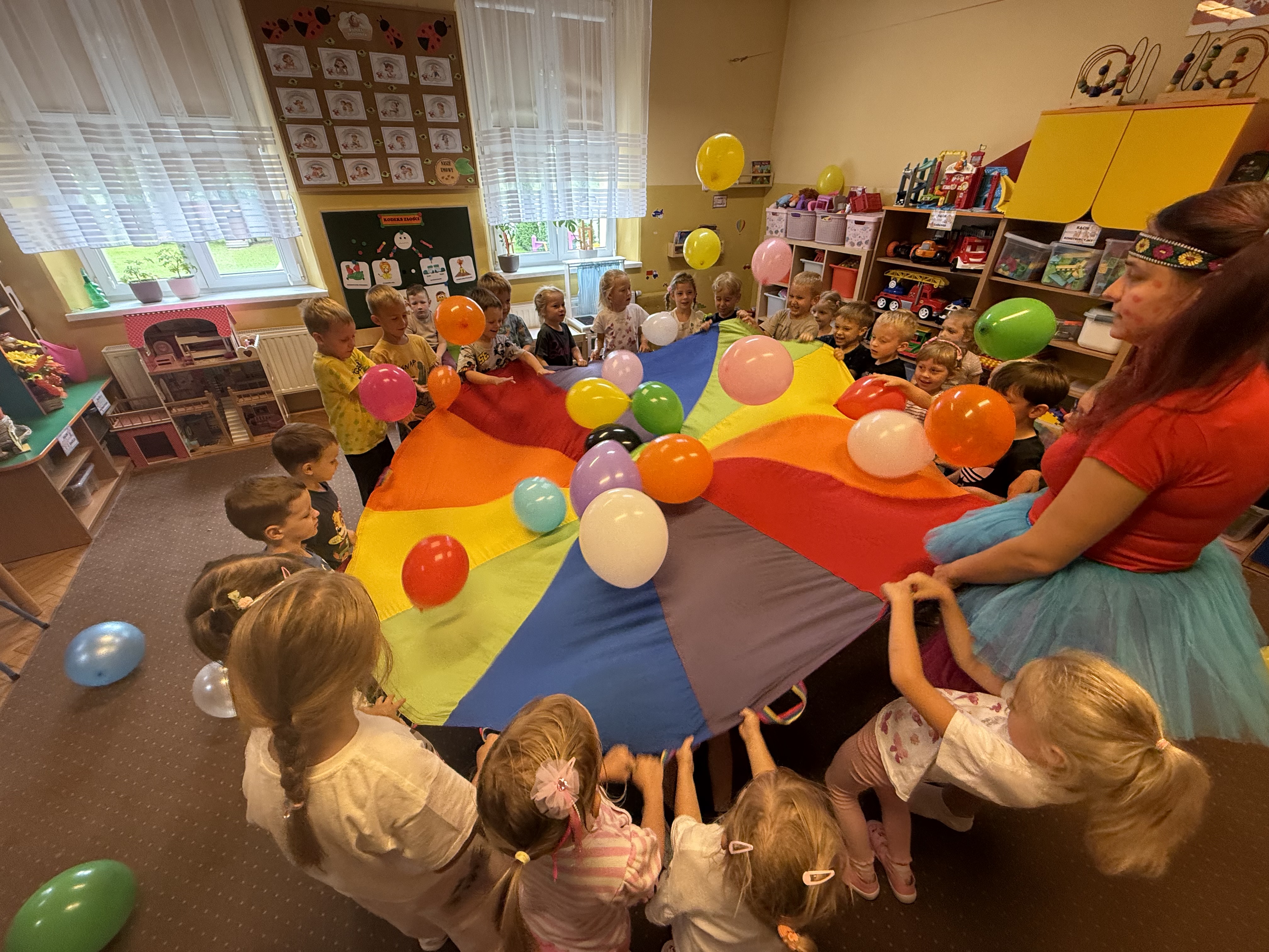 19 września w naszym przedszkolu świętowaliśmy Ogólnopolski Dzień Przedszkolaka. Był to dzień pełen radości, uśmiechu i niespodzianek! Dzieci uczestniczyły w niezwykłej podróży do świata nauki i przygód dzięki kinu sferycznemu, a następnie czekały na nie różnorodne atrakcje: zabawy muzyczne z wykorzystaniem chusty animacyjnej, wesołe harce z balonami, kreatywne malowanie na stretchu, gimnastyka na świeżym powietrzu, która dostarczyła mnóstwo energii i śmiechu. Na zakończenie każde dziecko otrzymało drobny upominek, który będzie miłą pamiątką tego wyjątkowego dnia.Święto przedszkolaków było wspaniałą okazją do wspólnej zabawy, rozwijania talentów i budowania pięknych wspomnień.
